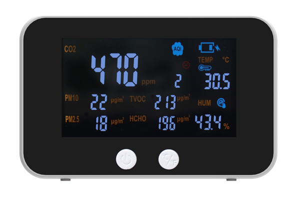 檢測(cè)參數(shù):二氧化碳CO2、空氣質(zhì)量PM10/PM2.5、溫度℃、濕度HUM、刺激性氣味TVOC、甲醛HCHO